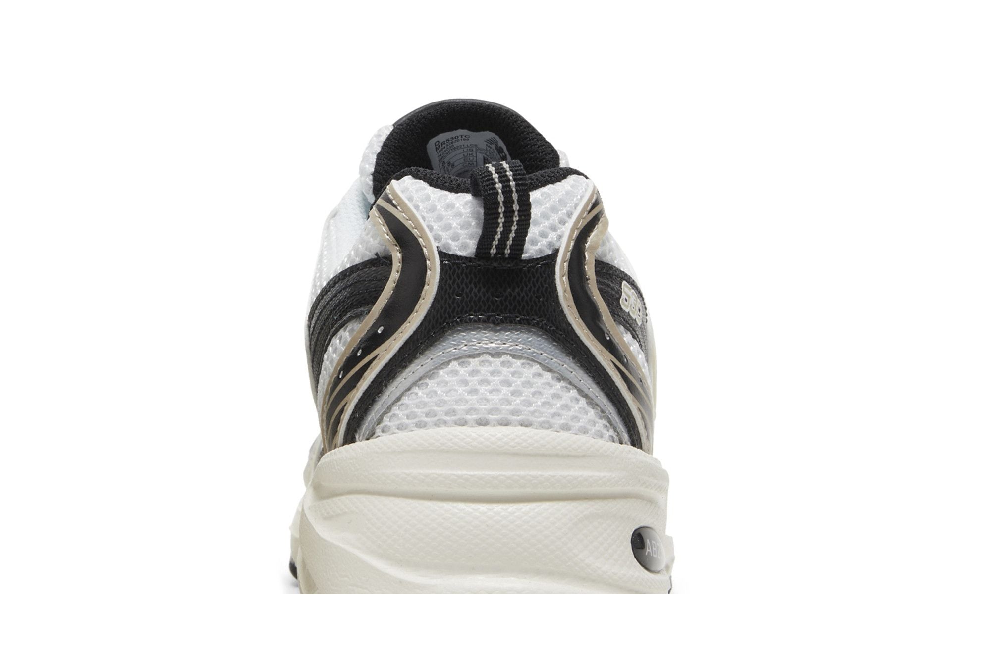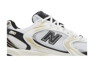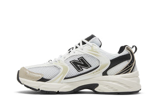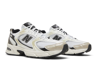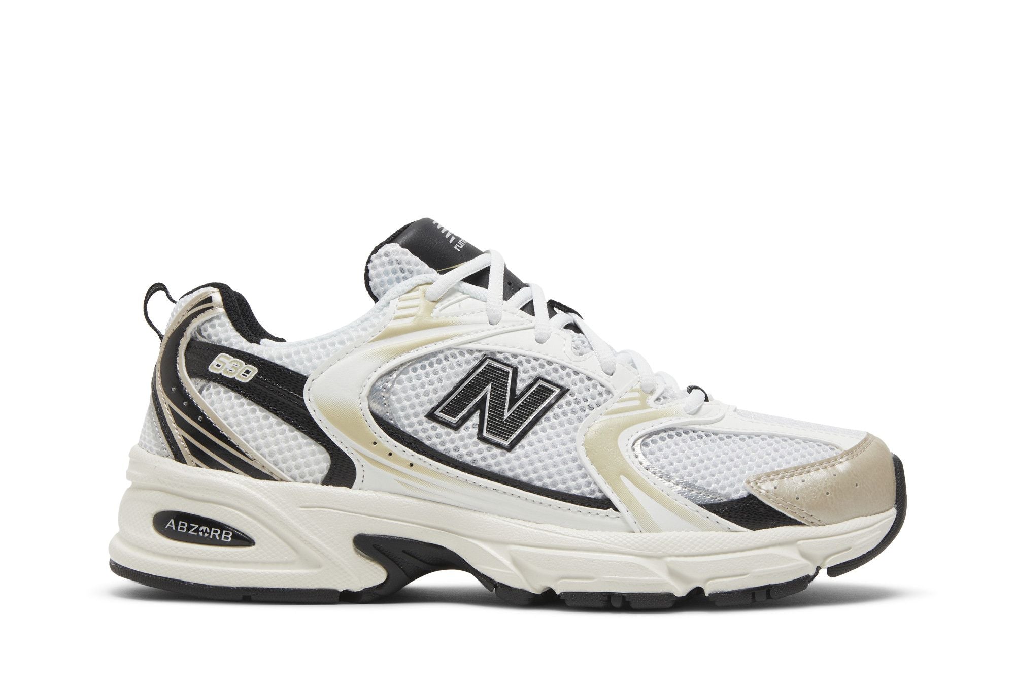 La New Balance 530 White Light Gold Metallic presenta una base in rete bianca, accentuata da rivestimenti in pelle sintetica bianca e dettagli metallici oro chiaro. Il tutto è valorizzato dal logo 'N' nero per un contrasto audace. L'intersuola, dotata di tecnologia ABZORB, assicura comfort e supporto perfezionando l'aspetto della coppia con una finitura elegante.