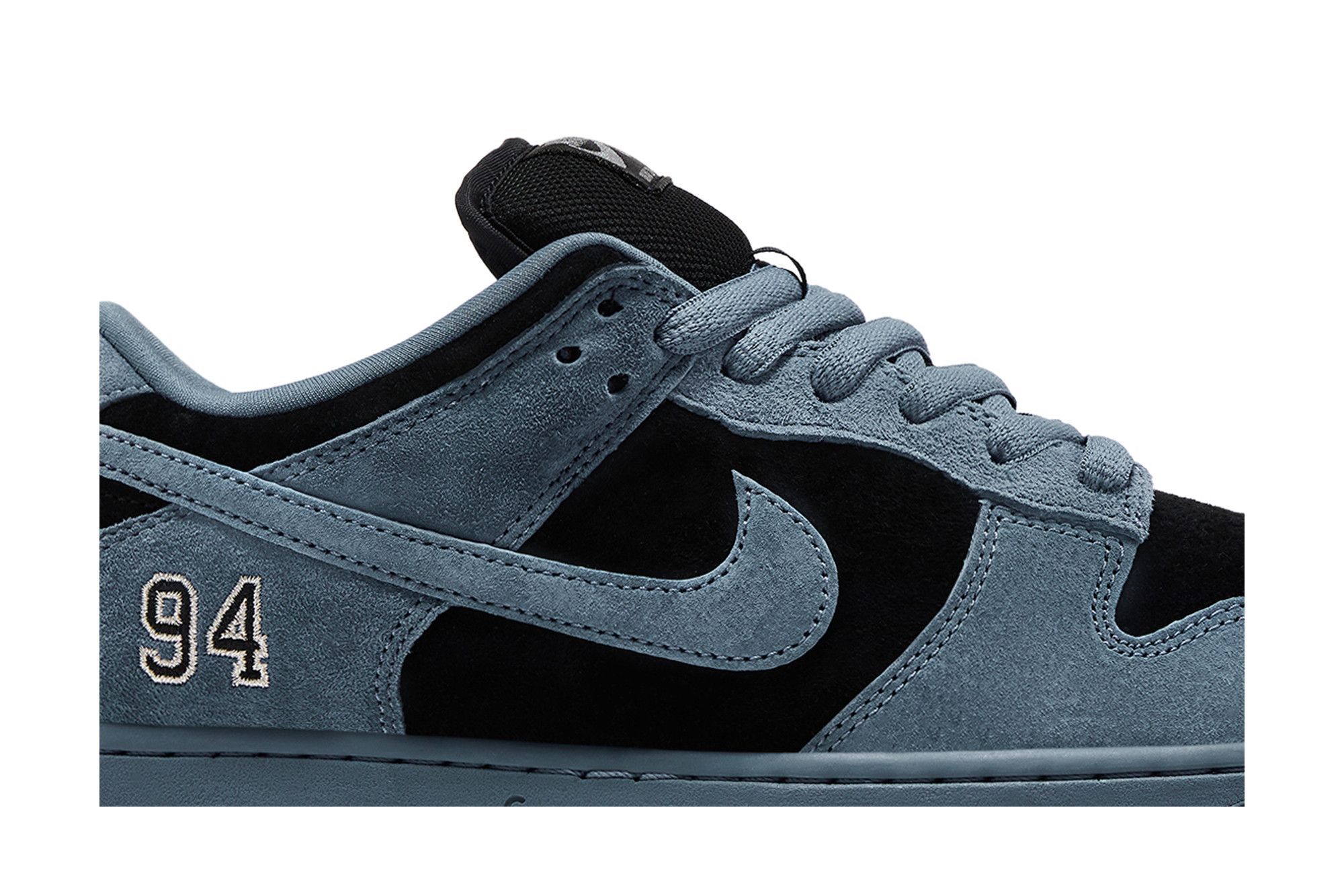 La Nike SB Dunk Low Supreme 94 presenta una combinazione di colori blu e nero, con una tomaia in suede. La suola è nera e presenta un design classico della linea Dunk. Sulla parte posteriore, è presente il numero "94" in bianco e nero, mentre sul lato della suola è stampato il logo "Supreme".