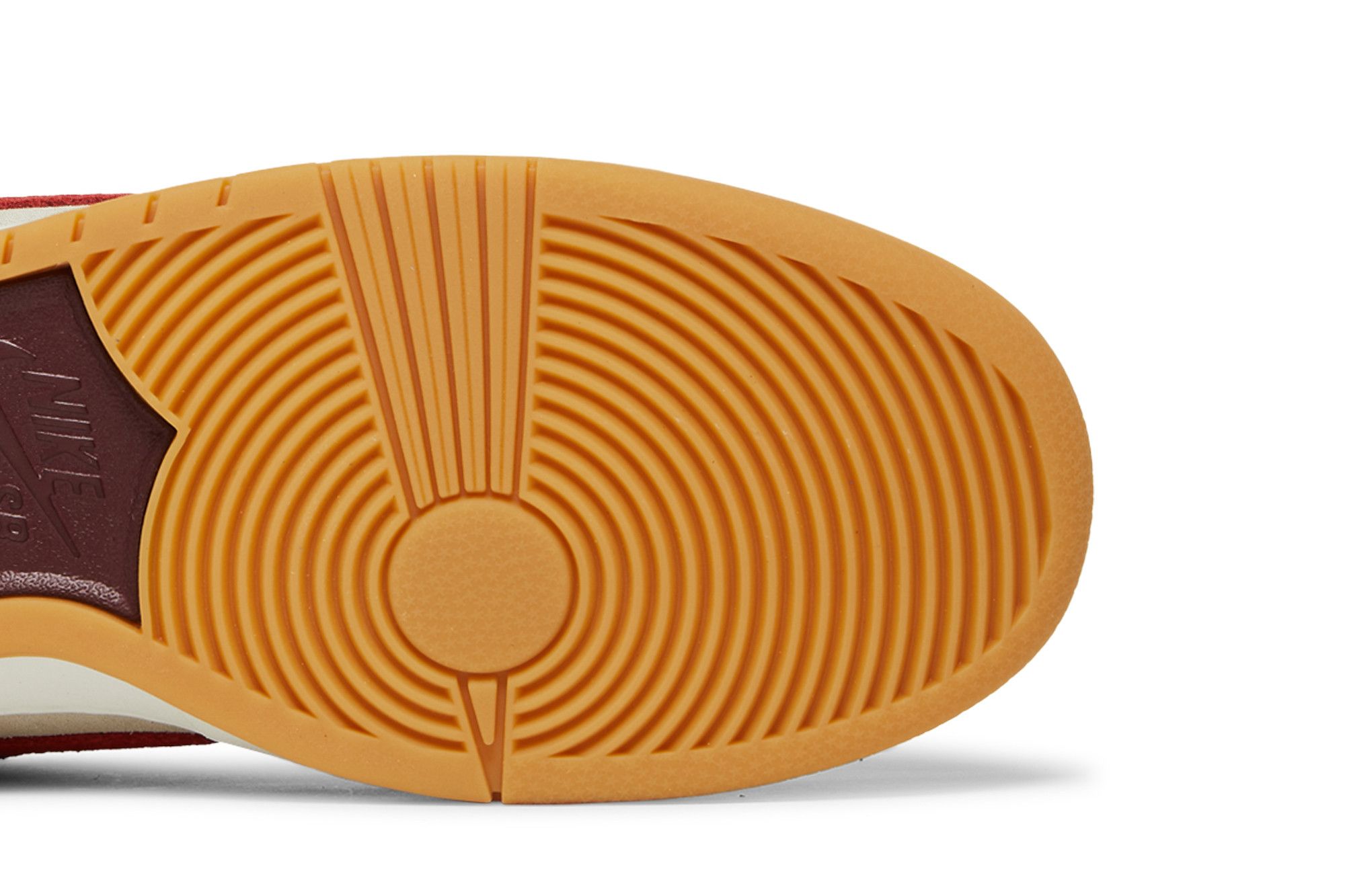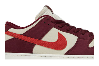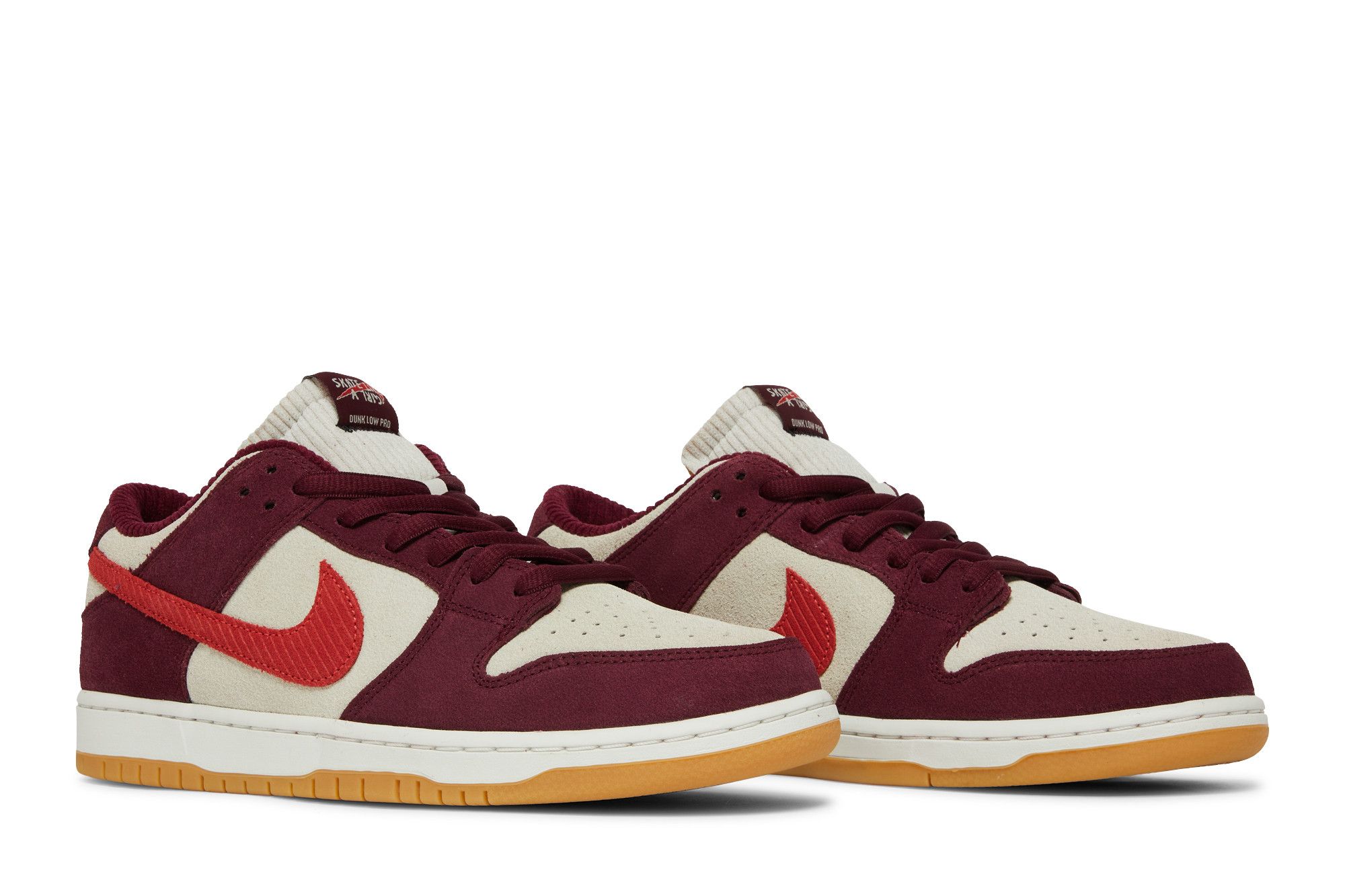 La Nike SB Dunk Low Skate Like A Girl presenta una base in pelle scamosciata bianco sporco, sormontata da strati esterni in pelle scamosciata bordeaux. Troviamo poi tocchi di velluto a coste come sullo Swoosh laterale, sulla fodera e sulla linguetta su cui poggia il co-branding. Per rafforzare ulteriormente questo sentimento di unità, sul tallone è ricamata una stretta di mano.