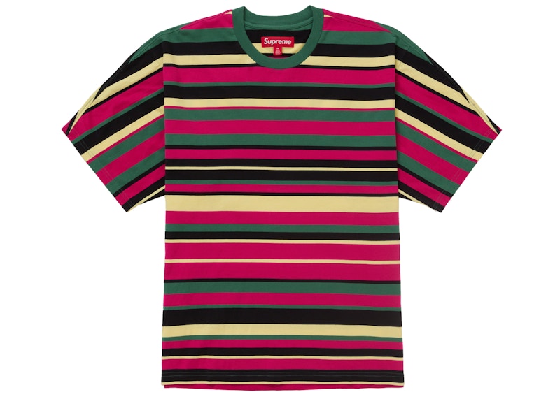 La Supreme Intarsia S/S Top (SS25) Stripe è una maglietta estiva con un design a strisce orizzontali multicolore, che include rosa, verde, giallo e nero. La maglietta presenta un taglio classico con maniche corte e un collo tondo. Sul davanti, non sono presenti grafiche particolari se non la scritta sul retro. Sulla parte posteriore, invece, è presente la scritta "Supreme" in bianco. Un'etichetta con lo stesso logo è posizionata all'interno della maglietta, vicino al collo. Il materiale non è specificato ma sembra essere di cotone. Questa maglietta è un capo versatile e comodo, ideale per un look estivo casual.
