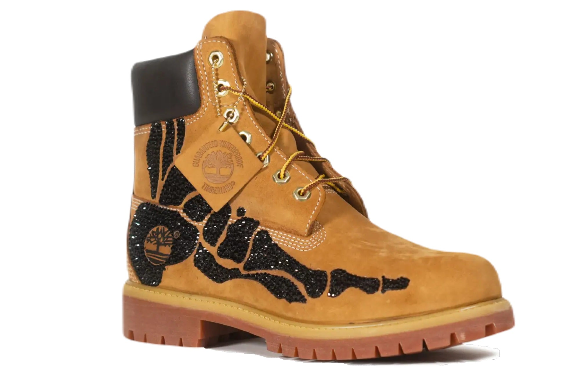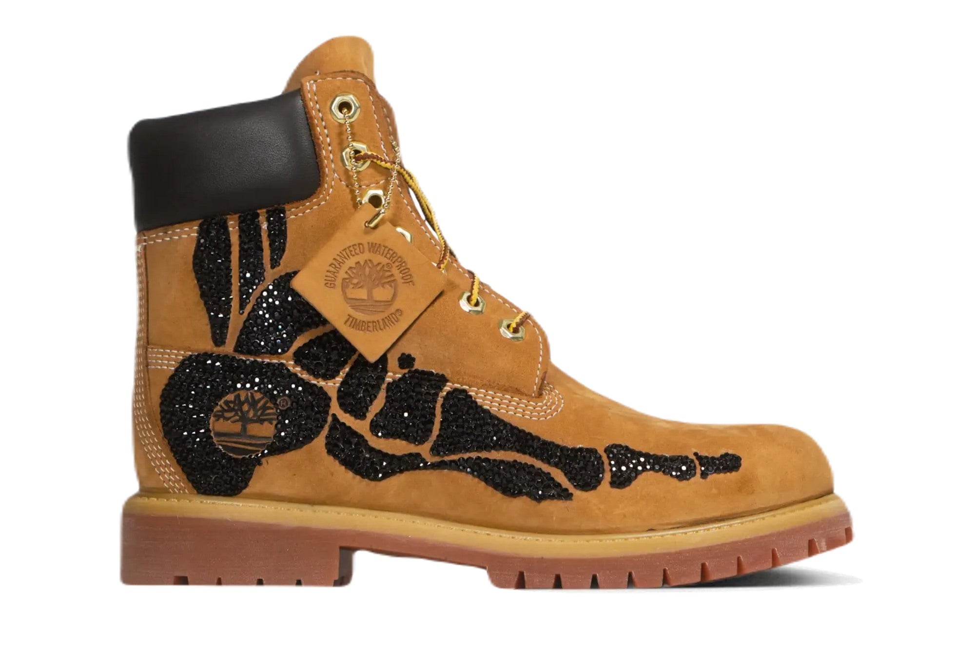 Il celebre stivale Timberland, noto per il suo design robusto e resistente, realizzato in spesso nabuck e dotato di una suola massiccia in gomma adatta a qualsiasi condizione atmosferica, è stato personalizzato da LASE per aggiungere un tocco di lusso. Il pannello laterale è stato impreziosito da una radiografia di un piede umano realizzata con brillanti neri, che donano al modello una lucentezza unica.